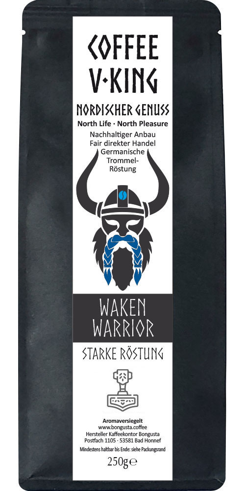 Die Wikinger sind als starke Kämpfer bekannt, von Ihren Freunden geliebt und von Feinden gefürchtet. Die nordischen Krieger kämpften für Ihre Herren und ließen sich ebenso von anderen Auftraggebern anheuern, die die Stärke der Wikinger zu schätzen wussten und diese für die Durchsetzung Ihrer Visionen benötigten. Wir als heutigen Generationen der Wikinger-Nachfahren absolvieren ebenso unsere täglichen Herausforderungen und bestehen im manchmal kämpferischen Alltag. Kaffee Waken Warrior weckt Kräfte, mit denen Nordmänner und Nordfrauen ihre Visionen durchschlagend erreichen, auch wenn es manchmal Thors Hammer Mjölnir benötigt. Die Spannbreite der Coffee V·King Kaffeesorten bietet für jede Gelegenheit den passenden aromatischen Kaffee. Wecke den Kämpfer in dir!